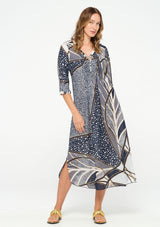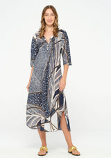 The Long Poppy Dress from One Season features a V neckline with button fastening at the bust, pintuck pleated detail, elbow length sleeves, subtle front pleating, a slightly curved hemline with side splits and finished with delicate raw ruffles around the neckline and sleeves. Crafted from a breathable cotton, this dress complements all body shapes with a flattering slightly loose fit that is ideal for everyday wear.