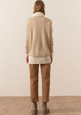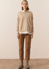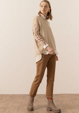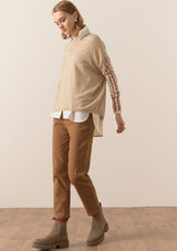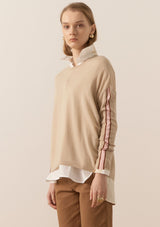 The Bennet Contrast Drape Knit from POL Clothing brings a fresh perspective to a beloved design, crafted from lightweight merino wool with a distinctive contrast stripe detail on the sleeves. Featuring a round neckline, dropped armholes, and slim-fit full-length sleeves, this knit epitomizes contemporary chic. The relaxed draped fit gracefully flows through the body, gently tapering in at the hem for a flattering silhouette.
