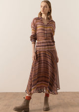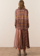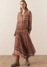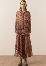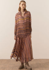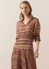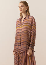 The Boulevard Shirt from POL Clothing highlights a traditional collar, front button closure, full-length sleeves with cuffs, and a longer line silhouette with a curved hemline. Featuring the exquisite Boulevard print in shades of mustard, toffee, marine, and charcoal against a pink backdrop, this shirt exudes sophistication. Crafted from 100% sheer silk in the exclusive Boulevard print, it blends elevated elegance with a comfortable, relaxed fit.