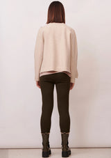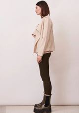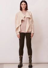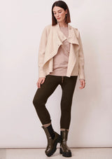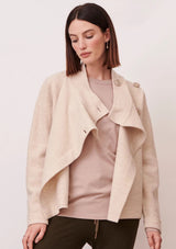 The Cabin Biker Jacket by POL Clothing is the perfect shape for keeping cosy when you don’t quite need a jacket. This fold over jacket features a high neckline with double button closure at the neck and side, full length sleeves and designed to sit at the hip. This unlined lightweight jacket is crafted from 100% Boiled Merino Wool.