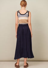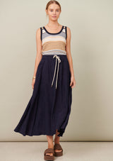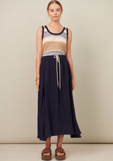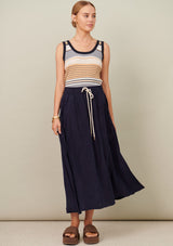 The Chloe Tank from POL Clothing is a classic sleeveless, scooped neck tank made from a premium linen and cotton blend fabrication. It features a self-bind neck and armhole and contrast colour striped detail.