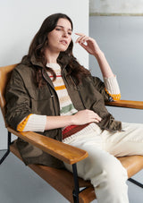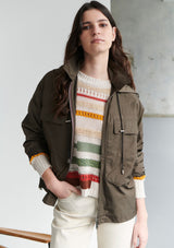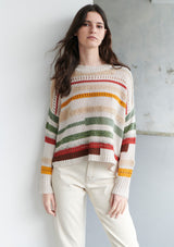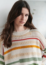 The Dales Multi Stripe Knit by POL Clothing features a cropped boxy silhouette with a round ribbed neckline, dropped armholes and wide ribbed detail at cuffs and hem. The multi-stripe detailing features different colours, textures and stitch combination to create a completely original texture. This relaxed fit knit is made from a linen and cotton blend.