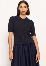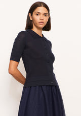 The Ezra Knit Polo Cardi from POL Clothing offers a fresh update for your spring wardrobe. It features a classic collar, button-down front and ¼ length sleeves. The pointelle rib stitch throughout creates an open, lacey effect without showing too much skin. Crafted from a soft cotton blend, this versatile piece also features raised stripe detailing on the sleeves and hem. Ideal for wearing as a top or a cardigan.