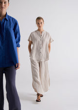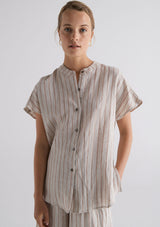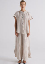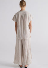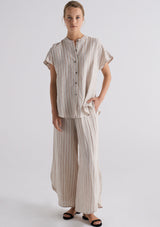 The Filter Shirt from POL Clothing features a stand collar, shell button closure through the centre front, short sleeves, side splits, back pleat and a hi/low curved hemline. Crafted from 100% Linen with a toffee stripe design, this shirt pairs perfectly with the Filter Pant for a complete and polished outfit.