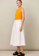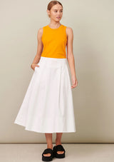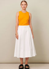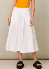 The Fringe Skirt by POL Clothing features a fixed waistband with button and invisible zip closure at the centre back, pleats, hip pockets and a deep hemline with raw edge detailing. This classic full shaped skirt is crafted from a washed cotton drill fabrication.