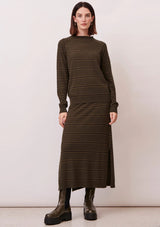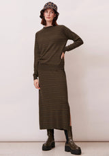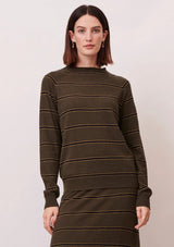The Grove Stripe Knit by POL Clothing features a high rolled neckline, full length sleeves with ribbed cuffs and hemline. This lightweight knit sweater is ideal for spring layering.