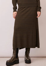 The Grove Stripe Skirt by POL Clothing features an elastic waistline, fitted and A line in shape with side splits. This lightweight knit skirt is ideal for spring layering.
