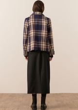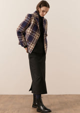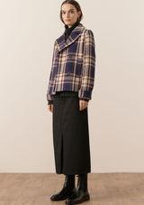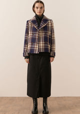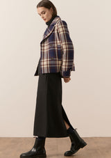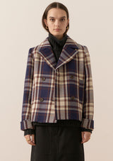 The Holland Pea Coat from POL Clothing offers a double-breasted design complete with a notched collar and large horn buttons. This coat also includes welted pockets and full-length sleeves with stylish strap accents at the cuffs. Adorned with a textured check pattern in shades of ink, toffee and pebble, along with a versatile navy lining, this slightly cropped and boxy piece elevates a winter essential into a statement piece.