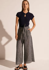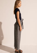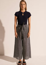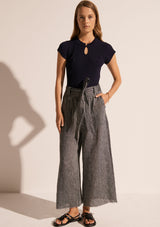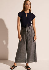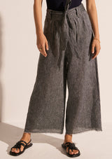 The Isla Pant from POL Clothing features a concealed zipper closure, belt loops including a tie belt, pleating, side pockets at hips, back flap pockets and a cropped wide leg with raw edge detail. Crafted from a luxe Italian linen with a pinstripe design, this lightweight pant is designed to look and feel great all day long.