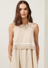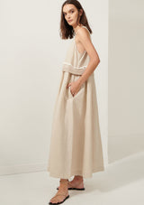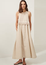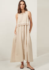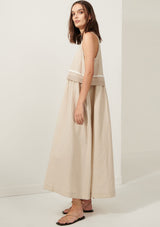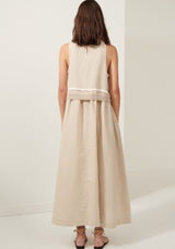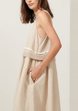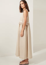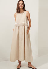 The Ivy Tank Dress from Australian Designer, POL Clothing is crafted from a textured linen blend. It features a sleeveless design with a round neckline, keyhole closure at centre back of neck, hip pockets, A-line skirt and contrast two tone knitted detail at the waist for a double layer effect.