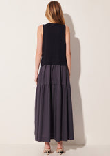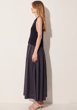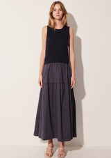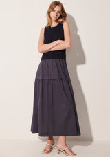 The Marcella Knit Dress by POL Clothing features a relaxed sleeveless style with a round neckline and banded hem top that is crafted from a Linen and Cotton blend yarn. The base of the dress is crafted from 100% Cotton and features a full skirt with gathering and tiered detail.