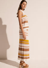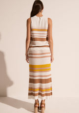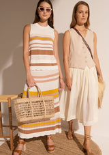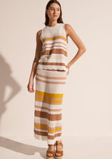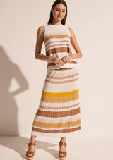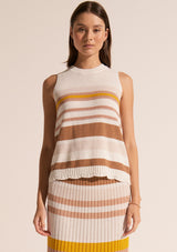 The Optic Tank by POL Clothing features a fitted sleeveless style with a high round neckline. This knitted tank with a tonal stripe design, is made from a linen and cotton blend and is an ideal choice for spring and summer.