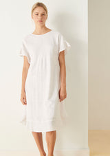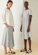 The cut is relaxed with a slight a-line silhouette. Offering a deep hem with curved ruffle and lined in cotton voile.