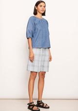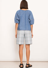 The Raydel Denim Top from POL Clothing offers a pull-on style, featuring a wide round neckline with gathering at front and back, blouson style elbow length sleeves and contrast topstitch detailing throughout. Crafted from cotton denim, this relaxed top has a vintage feel with modern styling. Pair with the Raydel denim pant for a complete ensemble.