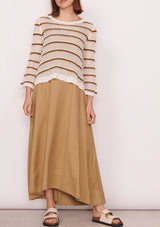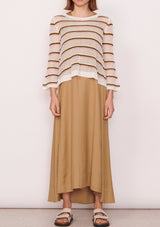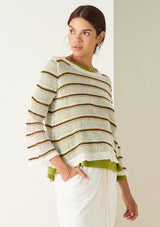 Perfect for Summer layering, the Willa Striped Knit features a tri-coloured stripe in a pointelle stitch. Designed with a round neckline, swing silhouette through the body. and slim fit sleeves that flare at the cuffs. Finished with ribs at the collar and hems.