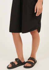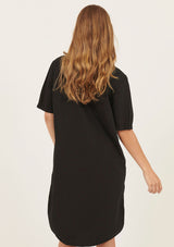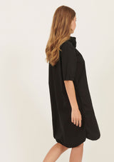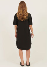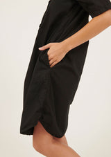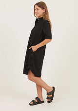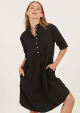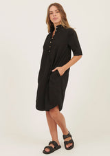 The Bibo Dress by Primness features a collarless neckline with front placket and shell buttons, two functional side pocket and a feminine shirt tail hemline. French seamed and top stitched for the ultimate finish. This relaxed fit dress is crafted from 100% woven cotton and can be worn dressy or casual.