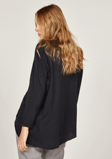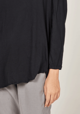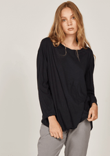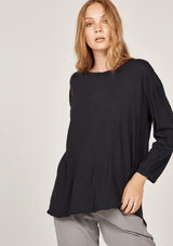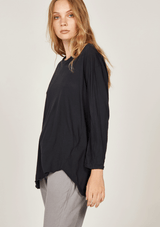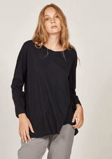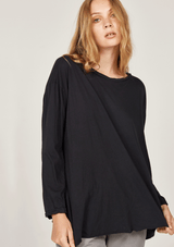 Long sleeved soft cotton top with rounded neckline. Twisted neckband. Relaxed fit. Asymmetric hem with raw edges. Natural stretch. Double needle sleeve cuff.