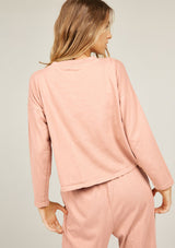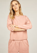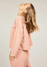 The Primness Cozy Track Top has a loose cut fit and is crafted from 100% Organic Heavy Cotton. It features long sleeves, relaxed fit, a simple A-line silhouette and dropped shoulders. The rounded neckline with a simple criss-cross detailing and the hemline and sleeve edges have a twin needle finish.