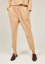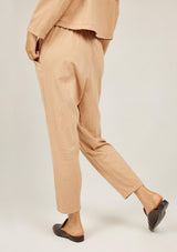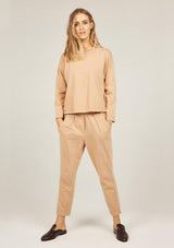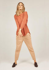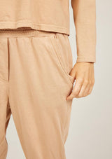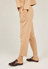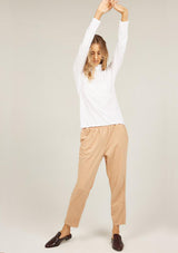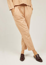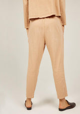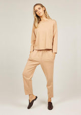 The Primness Cosy Twisty Pant is crafted from 100% Organic Heavy Cotton, a stretch fabrication. It features a relaxed fit, elasticised waistband, two internal side pockets with mock fly front. The silhouette features a tapered leg, light leg twist and natural stretch.