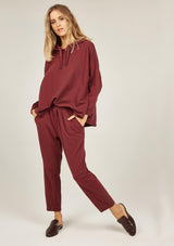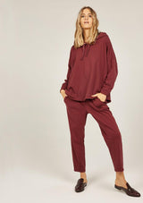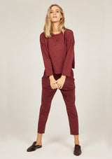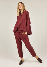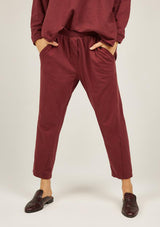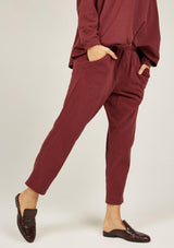 The Primness Cosy Twisty Pant is crafted from 100% Organic Heavy Cotton, a stretch fabrication. It features a relaxed fit, elasticised waistband, two internal side pockets with mock fly front. The silhouette features a tapered leg, light leg twist and natural stretch.