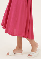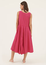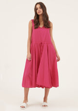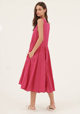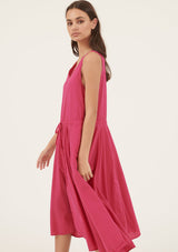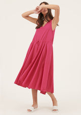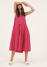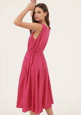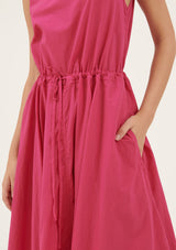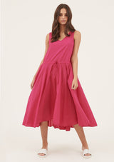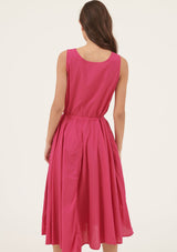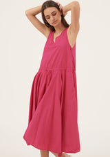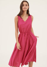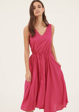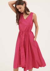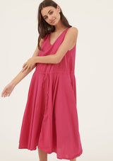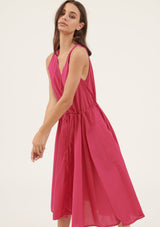 The Fifi Dress from Primness features a v neckline, drawstring tie waistline and a mid length full skirt bottom. Crafted from Cotton Voile, a non-stretch fabrication that is lightweight and ideal for everyday and travel wear.
