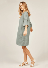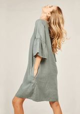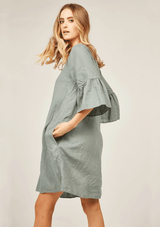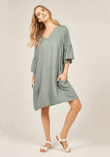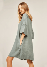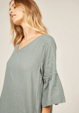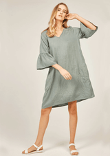 The Flossi Dress by Primness is crafted from 100% Linen. This Dress features bell sleeves with gathered detailing, a v neckline, two side pockets and falls to the knees. The blend of fit and fabrication makes this piece drape in all the right places.