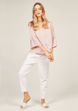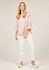 The Flossi Top by Primness is crafted from 100% Linen. This Blouse features bell sleeves with gathered detailing and a v neckline. French seamed and top stitched for a premium finish.