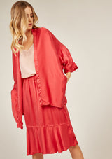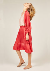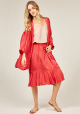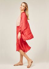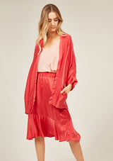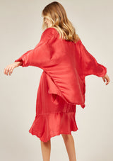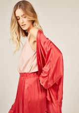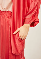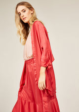 The Fluid Kimono by Primness is crafted from 100% Satin-Silk. This oversized Kimono features a collarless loose drop design with 2 side pockets and ¾ sleeves.
