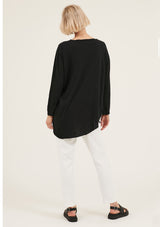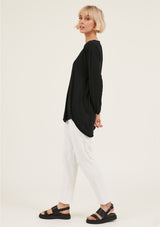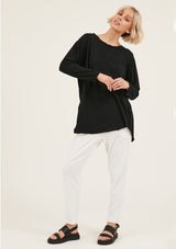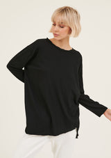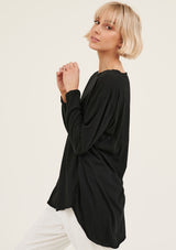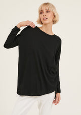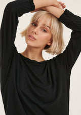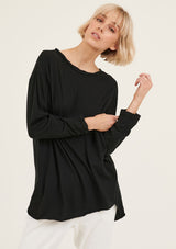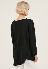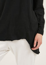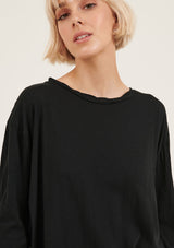 The Hap Long Sleeved Top is crafted in 100% Soft Cotton Jersey. It features a round neckline with twisted detailing, relaxed fit and asymmetric hem with raw edges. It has a natural stretch and a double needle sleeve cuff.