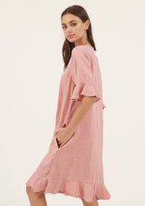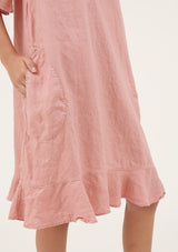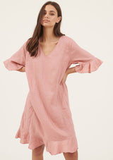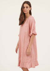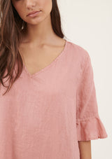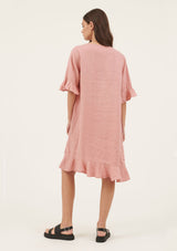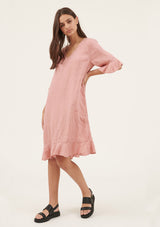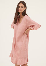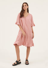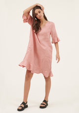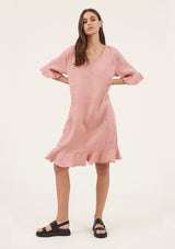 The Little Cove Dress by Primness features a v neck, ¾ length ruffled sleeves, a line shape with two internal side pockets and ruffled hemline. Crafted from 100% linen, a non-stretch fabrication that is breathable and ideal for everyday wear.