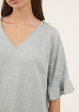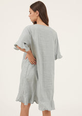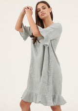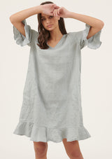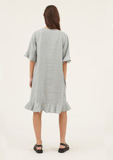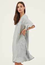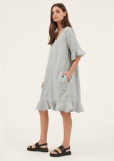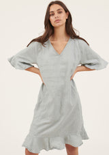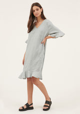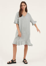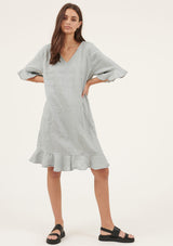 The Little Cove Dress by Primness features a v neck, ¾ length ruffled sleeves, a line shape with two internal side pockets and ruffled hemline. Crafted from 100% linen, a non-stretch fabrication that is breathable and ideal for everyday wear.