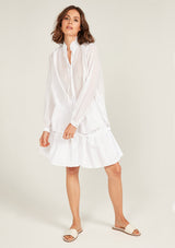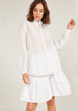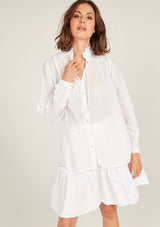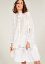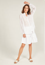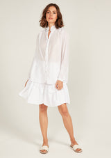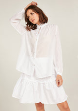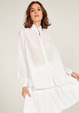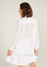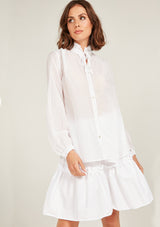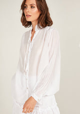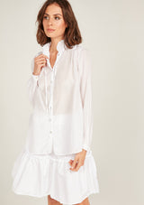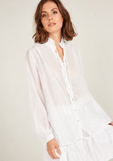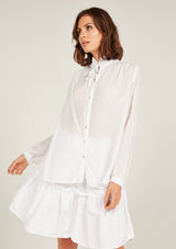 The Lucia Shirt by Primness is crafted in our signature silk/cotton this shirt gives you so many looks in one. Wear ties open for a free-spirited look or tied up for elevated elegance. Delicately gathered sleeve that are tapered in with a neat cuff. Special frilled neckline. Pretty shell buttons. Slightly sheer, perfect for light layering. All beautifully constructed with french seams and top stitching.