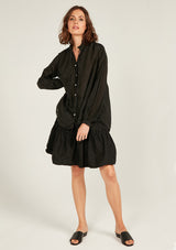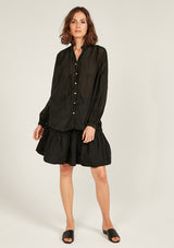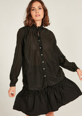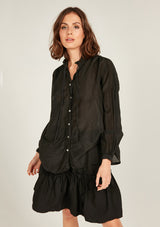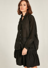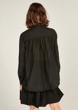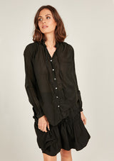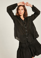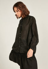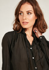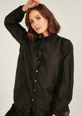 The Lucia Shirt by Primness is crafted in our signature silk/cotton this shirt gives you so many looks in one. Wear ties open for a free-spirited look or tied up for elevated elegance. Delicately gathered sleeve that are tapered in with a neat cuff. Special frilled neckline. Pretty shell buttons. Slightly sheer, perfect for light layering. All beautifully constructed with french seams and top stitching.