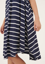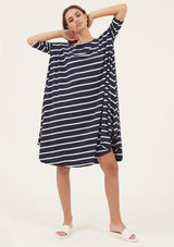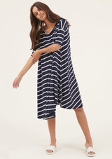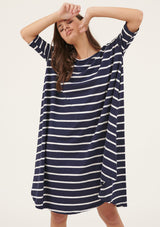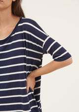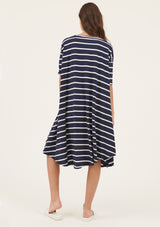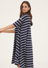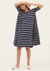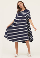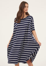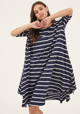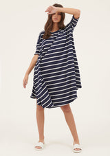 The Stripe Pop Dress by Primness is the perfect loose fit dress and it's back in a new block stripe. Constructed with an organic cotton jersey, featuring an asymmetrical hemline and rounded neckline. Twin-needle finish on both sleeve cuff and hemline. The Pop Dress is a wardrobe staple and an all-time loved Primness shape.