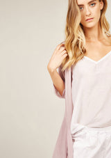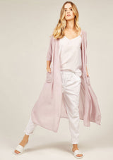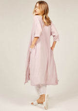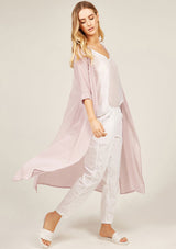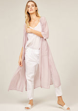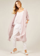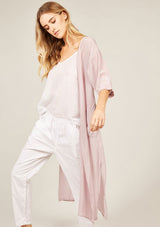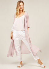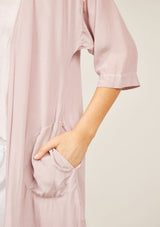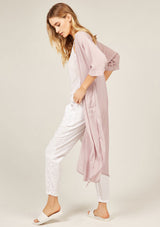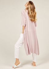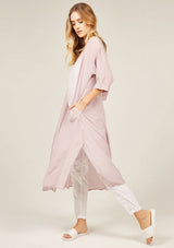 The Fluted Throw On by Primness is crafted from 100% Crepe Silk. This Throw features an open lightweight silk jacket with two side pockets. Elbow length sleeves with a wide cuff finish and a flowing silhouette with two small side seam splits.
