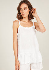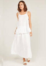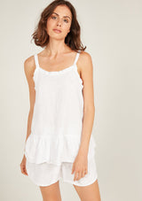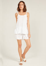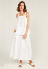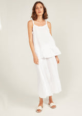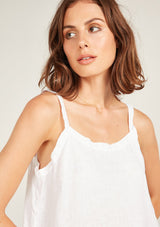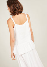 The Primness Tipa Singlet is a linen tank top featuring a gathered tiered hemline. Simple and pretty, this tank can be worn dressy or casual. All beautifully constructed with french seams and top stitching. Crafted of 100% linen.
