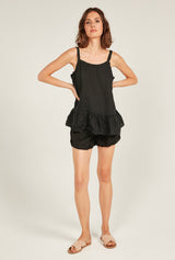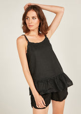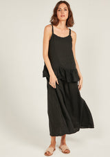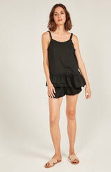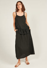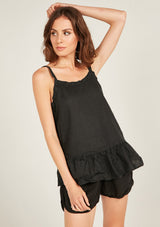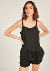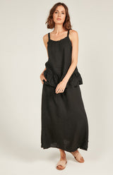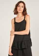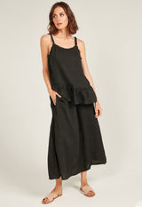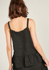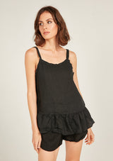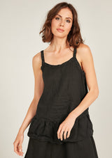 The Primness Tipa Singlet is a linen tank top featuring a gathered tiered hemline. Simple and pretty, this tank can be worn dressy or casual. All beautifully constructed with french seams and top stitching. Crafted of 100% linen.