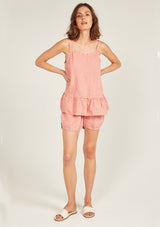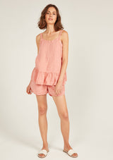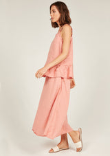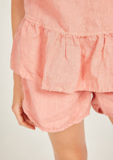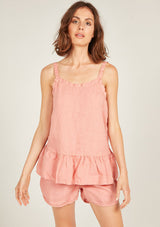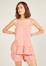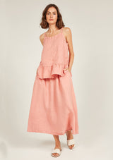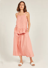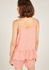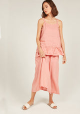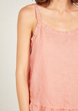 The Primness Tipa Singlet is a linen tank top featuring a gathered tiered hemline. Simple and pretty, this tank can be worn dressy or casual. All beautifully constructed with french seams and top stitching. Crafted of 100% linen.