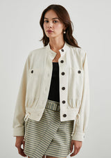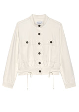 The Alma Jacket from Los Angeles designer, Rails, features a mandarin collar, full length sleeves with buttoned cuffs, welted side pockets and oversized patch pockets. The trapunto hem has a tunnel drawcord that lets you cinch the waist or lay it loose. Crafted from lightweight, soft linen blend fabrication, this military inspired jacket has a structured look and a soft, worn-in feel.