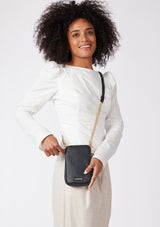 Constructed in black pebbled leather, zip top entry, wide mouth opening, four interior drop card slots, external pocket, adjustable cross-body strap.