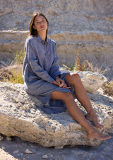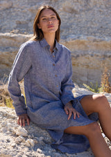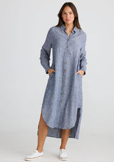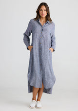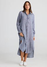 SH24214The Castro Overshirt from The Shanty Corporation features a shirt collar, full length sleeves with cuffs, side pockets, centre front button through opening and a back yoke with pleat detail. Crafted from 100% linen, this dress has a textured slub pattern that adds depth and character, making it a versatile and stylish addition to your wardrobe.