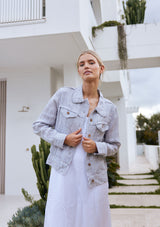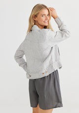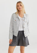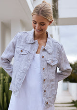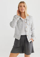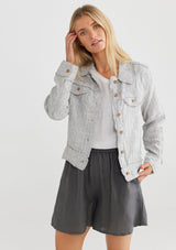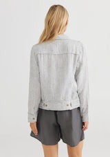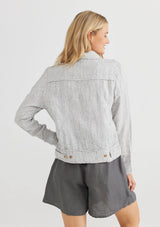 SH2524The Monza Jacket by The Shanty Corporation features a classic collar, button down closure, chest flap pockets, inseam waist pockets and raw edge detailing. This versatile jacket is cut for a regular fit and crafted from 100% linen with a delicate striped pattern.