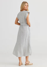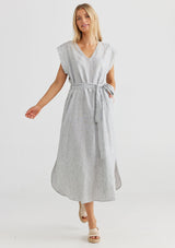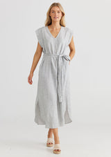 SH23141The Sebou Dress by The Shanty Corporation features a flattering V neckline, short sleeves, side pockets, curved hem and a removable belt tie. This dress is cut for a regular fit and crafted from 100% linen in a delicate striped pattern.