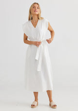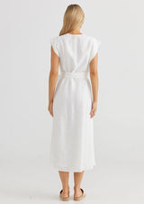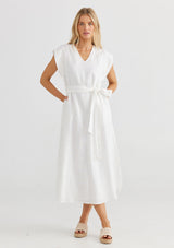 The Sebou Dress by The Shanty Corporation features a flattering V neckline, short sleeves, side pockets, curved hem and a removable belt tie. This dress is cut for a regular fit and crafted from 100% linen, a non-stretch fabrication that is breathable and ideal for everyday wear.