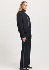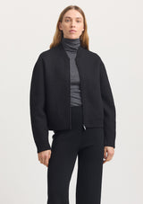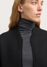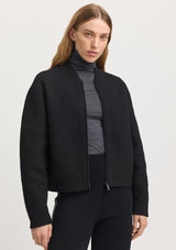 The Wool Bomber Jacket by Toorallie has a semi-felted texture made of Australian Merino Wool. This soft jacket is in between outerwear and knitwear with a zip close, angled pockets, and double-layer cuff and neck trims
