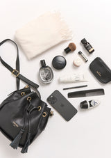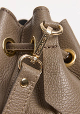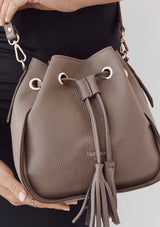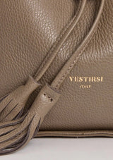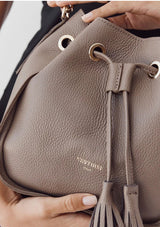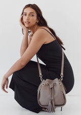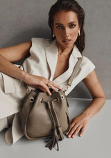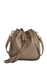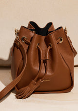 The Bridgetta Bucket Bag from VESTIRSI is a crossbody worthy of becoming your new everyday staple. Featuring pale gold hardware and a front drawstring top that opens to reveal space inside for your daytime essentials. Finished with a gold foil logo and leather tassels for a subtle yet chic daytime look. Use the adjustable and detachable leather strap to wear on the shoulder or cross-body.