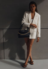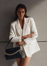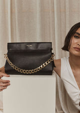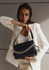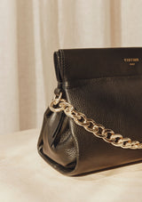 The Esther Chain Bag from VESTIRSI is handmade in Italy from luxe pebbled Italian leather, embellished with a statement chain detail and a minimal gold logo. Esther can be tucked under your arm or crossbody via the long thin adjustable strap when on the go. The front chain detail can be removed for an elegant pared-back look.
