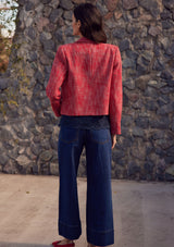 With its cropped silhouette and unique fire boucle texture, the Adjoin Jacket blends vintage elegance with contemporary luminosity. Red and white threads create a sophisticated visual, while the neat collar and curved pocket flaps add refined femininity