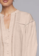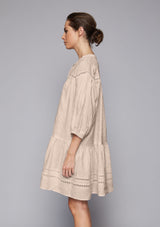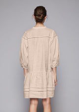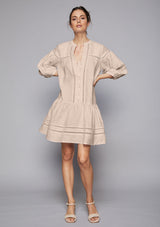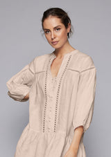 The Beckon Dress from Zoe Kratzmann blends luxe details to create a timeless forever piece. It features a high open tab neckline, blouson sleeve, delicate covered front centre buttons and a gathered drop waist which is effortless and flattering. Elevated detail such as pintucks, embroidery and lace trim create a feminine style. It blends a chic polished look with a free-spirited feel making it the ideal choice for everyday wear.