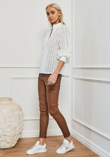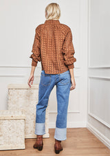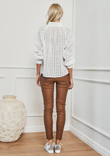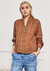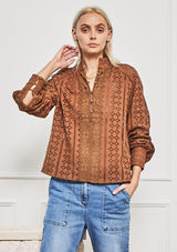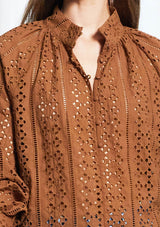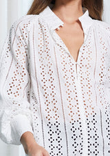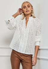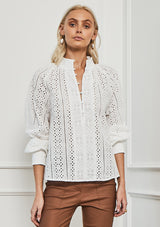 Crafted in a luxurious geometric broderie the bloom top by Zoe Kratzmann balances old-world sophistication with a modern elegance. A high neckline, delicate covered buttons and a full-length blouson sleeve display strength yet softness.